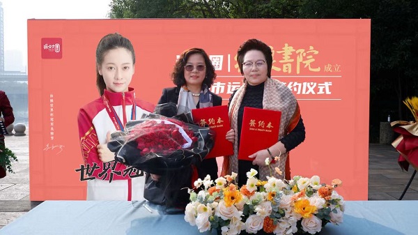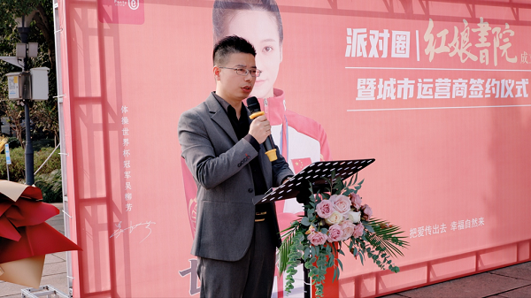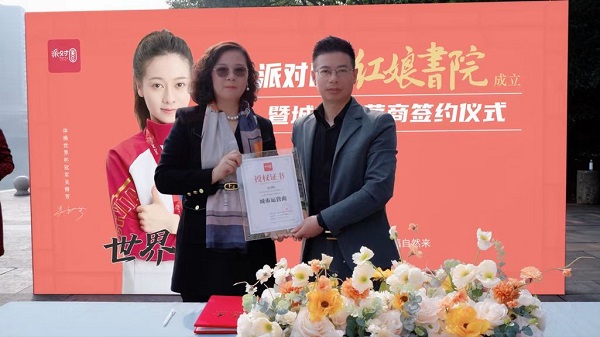 11:38,签约仪式开始,派对圈科技全国市场总经理曹建芳、乾湖堂文化晓燕总代表两方上台,执笔正式签约。同时派对圈科技CEO熊士清为乾湖堂文化晓燕总颁发城市运营商授权证书。随着,派对圈绍兴三区城市运营商正式落地,意味派对圈城市运营商全国招商大幕正式开启。