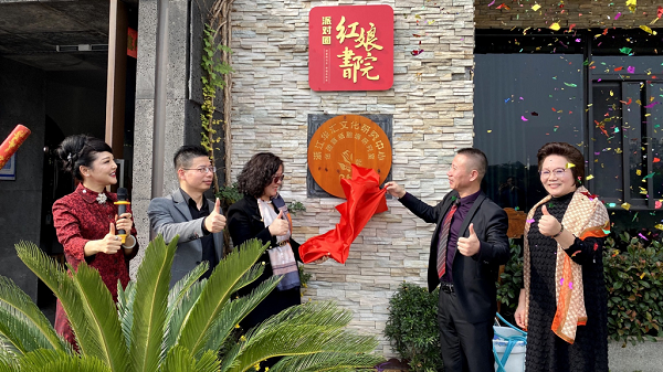 11:50,主持人宣布派对圈红娘书院绍兴总院成立仪式开始,浙江省朗诵协会副会长、绍兴朗诵协会主席、绍兴朗诵群创始人,派对圈红娘书院全国总院长何琳尔老师受邀作了 “帮人圆梦—圆爱情梦”主题分享,同时也对派对圈红娘书院绍兴总院成立表示了祝福和期待。随后,何琳尔总院长和乾湖堂文化晓燕总,与派对圈CEO熊士清、全国市场总经理曹建芳共同为派对圈红娘书院绍兴总院揭牌。