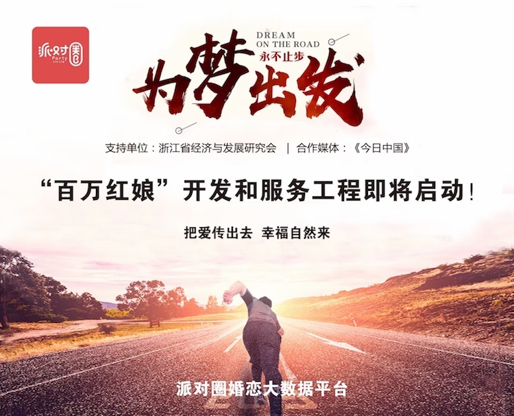 “为梦出发,永不止步”——派对圈“百万红娘”开发和服务工程 将于5月20日正式启动!本次工程支持单位:浙江省经济与发展研究会,合作媒体:《今日中国》。